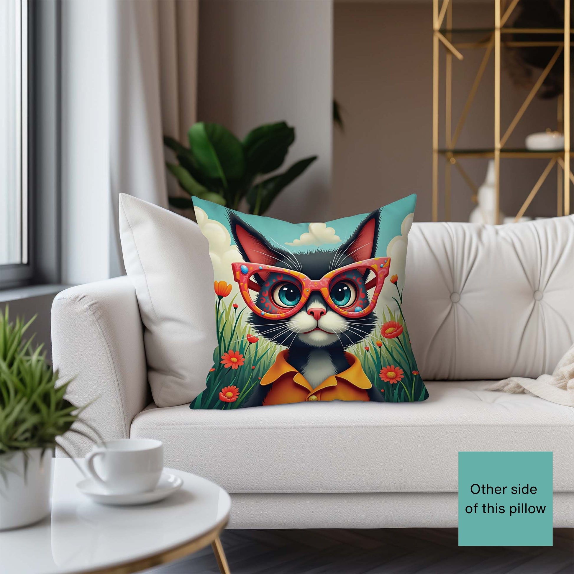Looking for a quirky housewarming gift for cat owner? This vibrant pillow showcases a charming black cat standing in a lush garden on a spring day. Adds a dash of retro whimsy to your home décor. The pillow has a sky blue accent color on the reverse side.