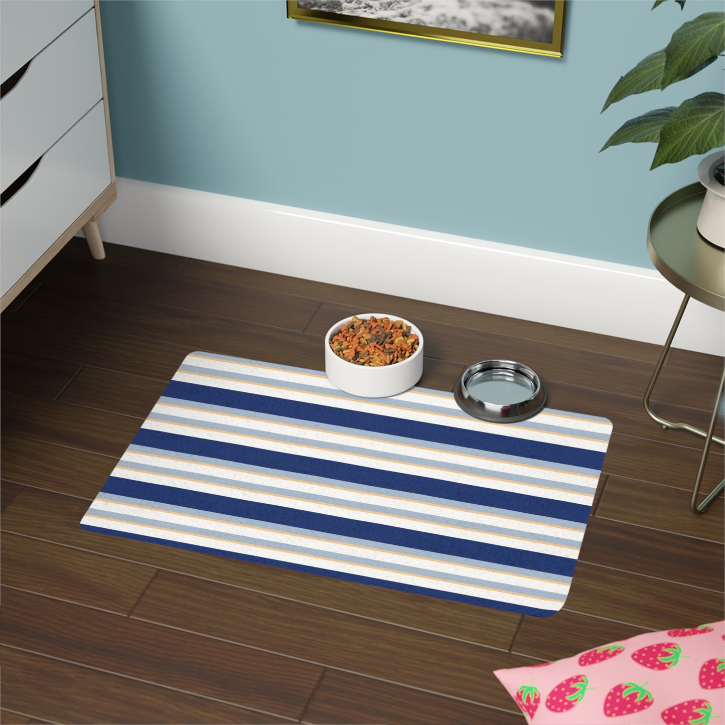 Include a nautical aesthetic to your pet's feeding area with this blue, navy, and gold striped pet feeding mat. This feeding mat not only minimizes mess but also adds a clean, crisp vibe. Made with a non-slip rubber base, this pet feeding mat stays in place, even when the clumsiest puppies are eating. Each mat is rectangular, thick, and perfect for dogs and cats.
