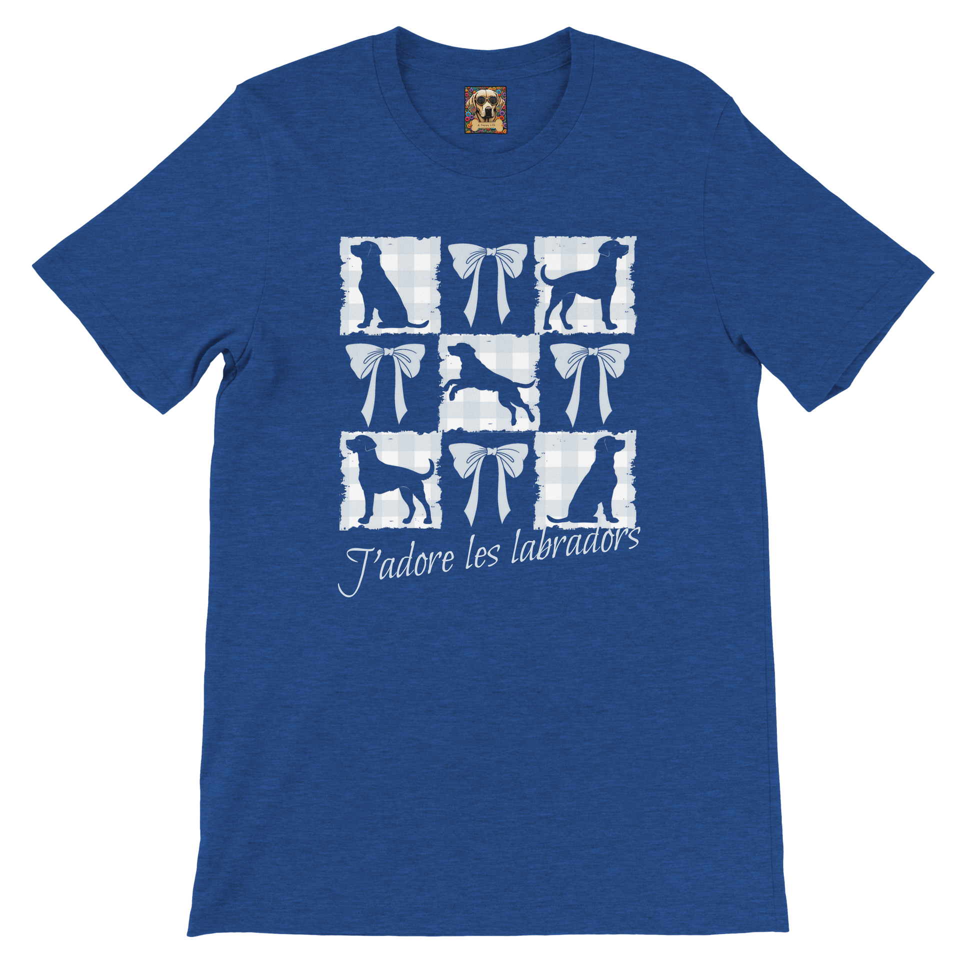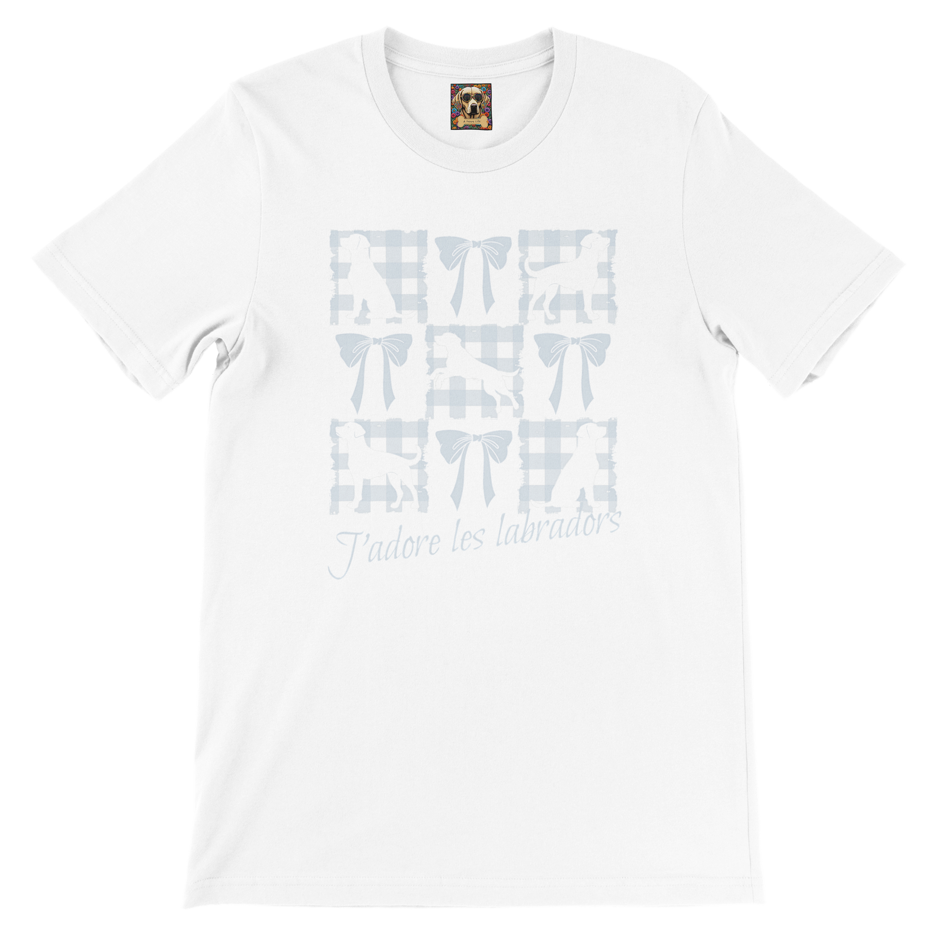 Celebrate your love for Labradors with this sweet, romantic, and vintage-inspired t-shirt! Designed with a pretty powder blue gingham check pattern, this piece blends timeless elegance with a playful, feminine touch. A whimsical collage grid with powder blue check squares showcases graceful silhouettes of Labradors in various poses—sitting, standing, and jumping alternating with matching bows. Add your own confidently assertive phrase for a personalized touch to complete the coquette core vibe.